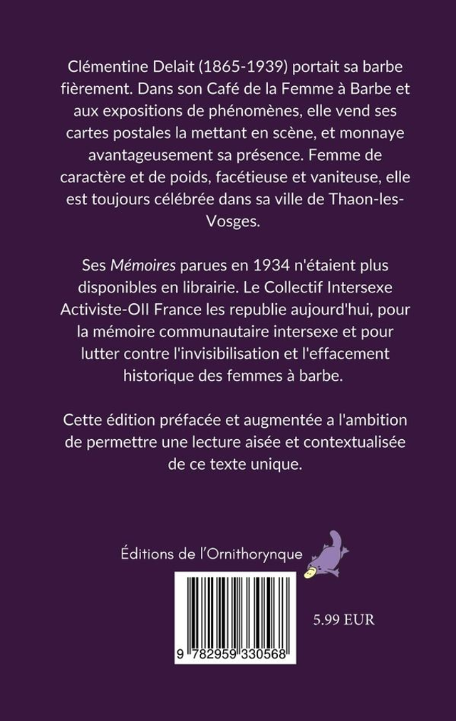 Clémentine Delait (1865-1939) portait sa barbe fièrement. Dans son Café de la Femme à Barbe et aux expositions de phénomènes, elle vend ses cartes postales la mettant en scène, et monnaye avantageusement sa présence. Femme de caractère et de poids, facétieuse et vaniteuse, elle est toujours célébrée dans sa ville de Thaon-les-Vosges. Ses Mémoires parues en 1934 n’étaient plus disponibles en librairie. Le Collectif Intersexe Activiste – OII France les republie aujourd’hui, pour la mémoire communautaire intersexe et pour lutter contre l’invisibilisation et l’effacement historique des femmes à barbe. Cette édition préfacée et augmentée a l’ambition de permettre une lecture aisée et contextualisée de ce texte unique.